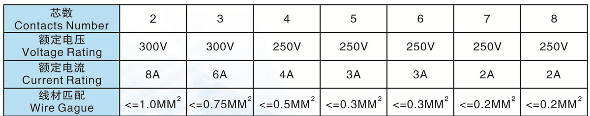 線材匹配(Wire Gague):<=1.0MM2 <=0.75MM2 <=0.5MM2 <=0.3MM2 <=0.3MM2 <=0.2MM2 <=0.2MM2